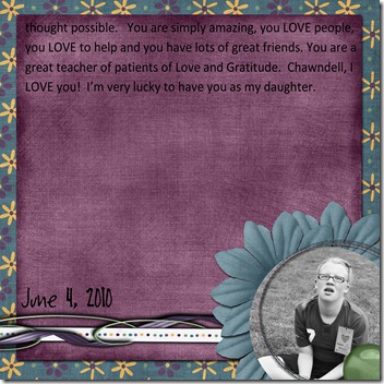 OK so this was way hard!!! I love love how my layout turned out, but it is a 5 pager. :o) This week was all about making a layout without pictures and journaling so you can picture the story without the pictures. I made a 5 pager and I cheated a little. I figured my journaling was so long I added a picture at the very end of the journaling.